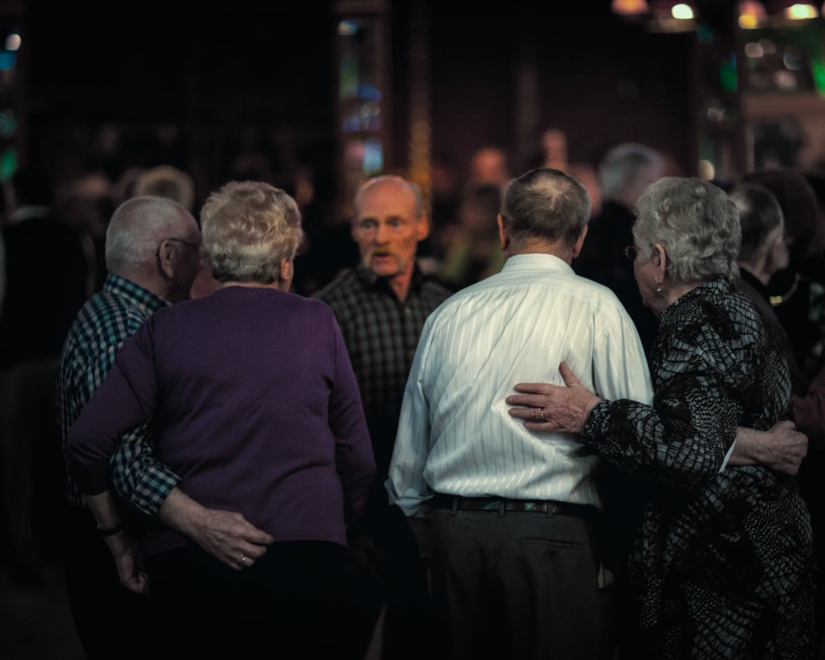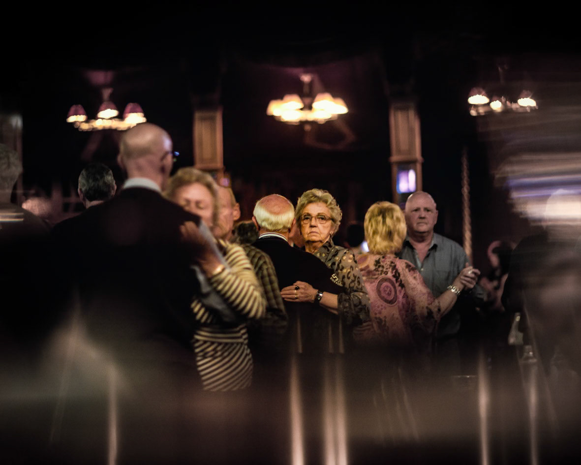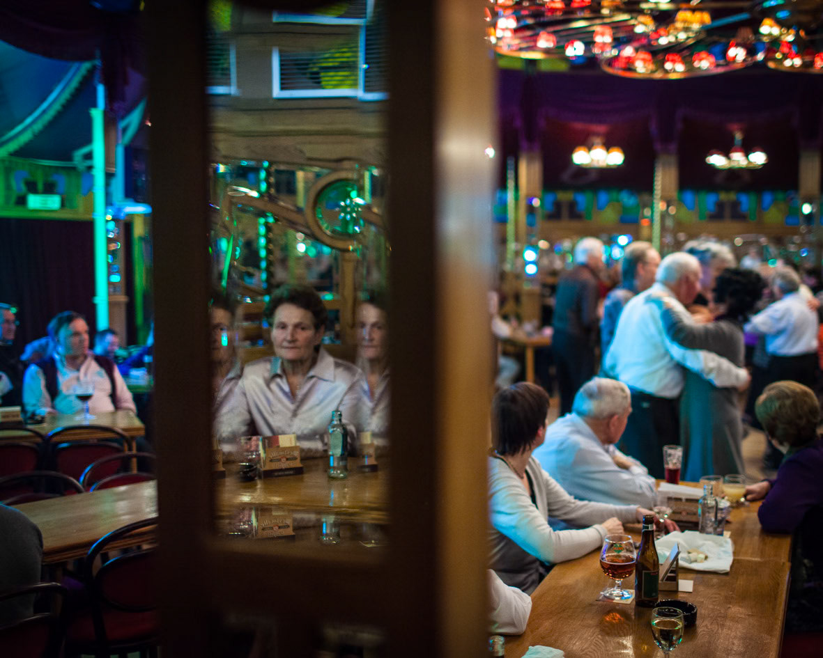 A wordless reflection on a phenomenon that emerged in the 1920s and appears equally alive nearly a century later: the Mirror Hall . Inside the Mirror Hall in the Flemish Kempen, older bodies continue to dance, week after week, as if time has settled somewhere around a perpetual fairground. Though transience is tangible, the tent itself seems suspended—untouched by the concerns and conditions of the outside world. The photographs observe a weekly dance matinée as a quiet ritual, where movement, repetition, and presence form a space temporarily outside of time. noteworthy: my parents used to go there when they were young!